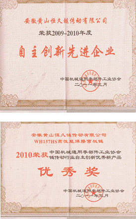 日前,在中国机械通用零部件工业协会五届二次理事会上,我公司被授予2009~2010年度“自主创新先进企业”称号。同时,“黄山”牌WH157HS高性能焊接弯板链产品荣获“自主创新优秀新产品优秀奖”称号。