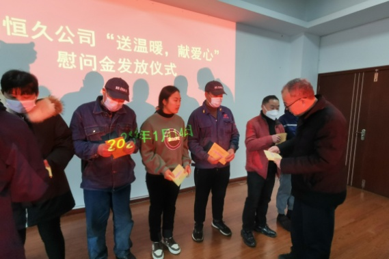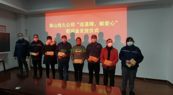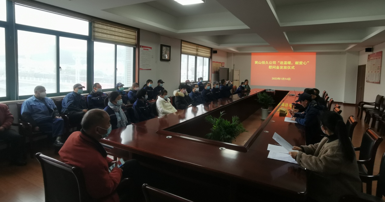1月14日下午,黄山ballbet贝博二楼大会议室暖意洋洋,公司在这里举行2022年度困难职工慰问金发放仪式, 39名困难职工从陈亦兵总经理等领导手中接过慰问金,增添了和谐与欢乐。