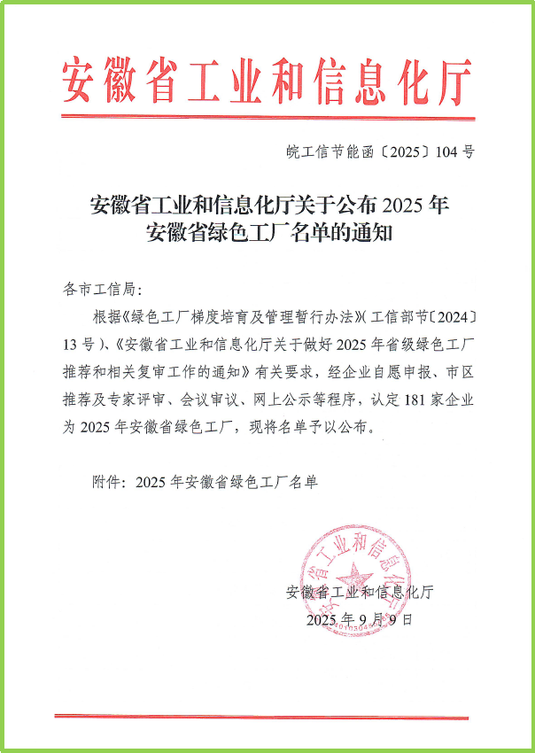 近日,安徽省工业和信息化厅正式公布2025年度省级绿色工厂认定名单,黄山ballbet贝博成功上榜。
